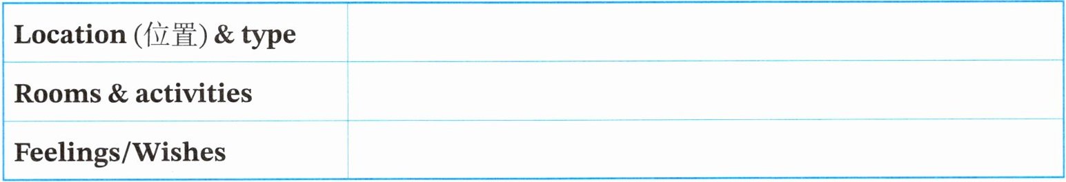 本题要求介绍理想中的家,需结合表格提示从位置与类型、房间与活动、感受与愿望三方面写作,运用七年级下册所学的地点描述、日常活动表达相关词汇和句型,词数控制在80左右,保证语句通顺连贯。