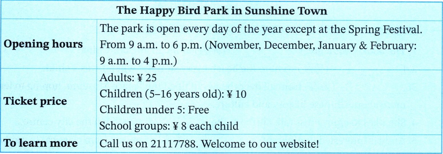 1. 根据表格中Opening hours板块的信息“The park is open every day of the year except at the Spring Festival.”,可知该公园仅在春节期间关闭。