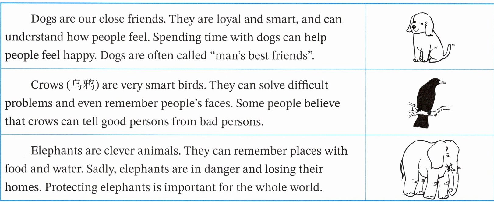 3. 对各选项分析:A选项,原文未表明狗是唯一能帮助人们感到开心的动物,表述错误;B选项,原文没有对比乌鸦和大象的聪明程度,表述错误;C选项,根据最后一段“Protecting elephants is important for the whole world.”可知,大象对整个地球很重要,表述正确;D选项,原文仅提到大象处境危险,并非三种动物都濒危,表述错误。因此选C。