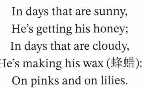 1. 第1题:“Buzz”是拟声词,用来模拟蜜蜂发出的嗡嗡声,所以选A。2. 第2题:根据诗歌中“In days that are cloudy, He’s making his wax (蜂蜡)”的内容,可知阴天蜜蜂忙着制作蜂蜡,所以选C。3. 第3题:根据“From morning’s first light”(从清晨的第一缕光),对应的时间应延续到夜晚,所以缺失的单词是night,选A。4. 第4题:诗歌中提到蜜蜂是“happy, good fellow”且“a great worker”,还描述它从早到晚边唱歌边工作,体现出蜜蜂是勤劳又快乐的小动物,所以选B。