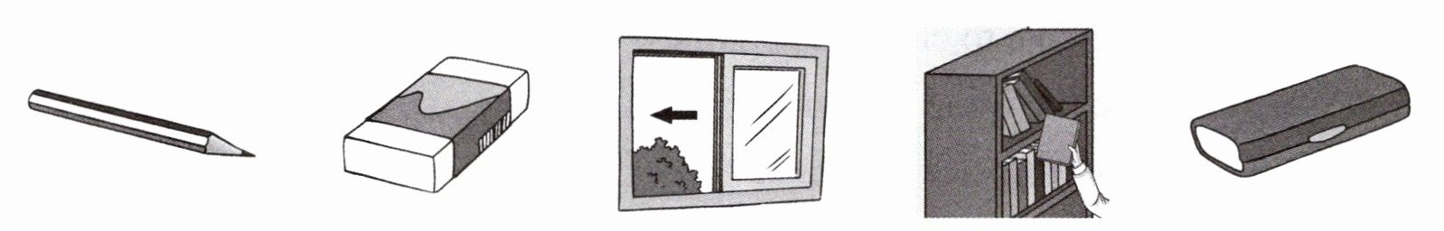 这是听录音排序题,需依据听到的音频内容给图片标号:铅笔对应第5,橡皮对应第2,窗户对应第4,书架放书对应第3,文具盒对应第1,最终得到排序结果。