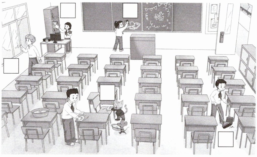 5. 最右下角方框对应扫地的同学,对应短语C. sweep the floor;