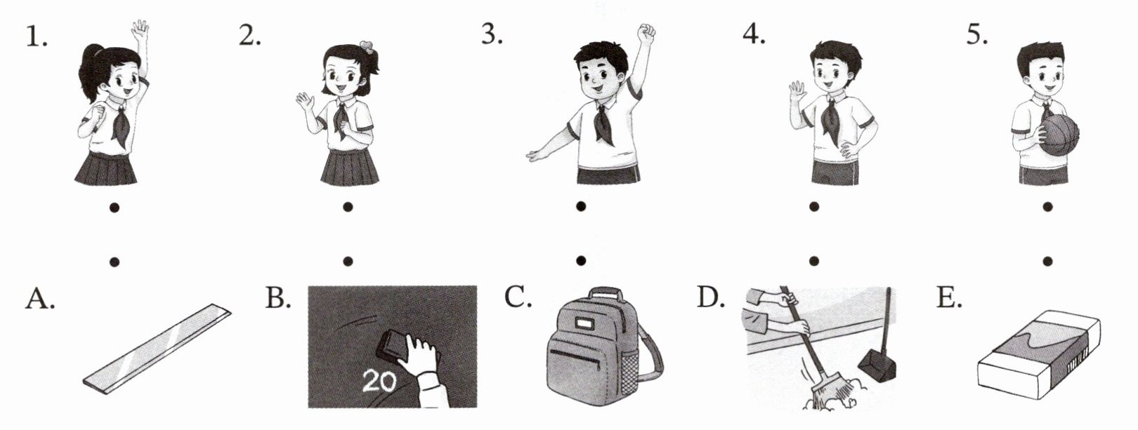 A. clean the blackboard B. clean the chair C. sweep the floor D. put away the books E. close the window