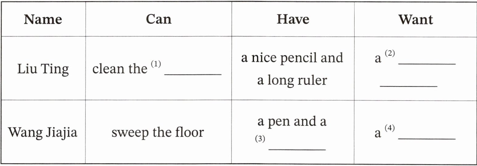 本题是听力表格填空题,需根据录音内容,结合表格里人物对应的能力、拥有物品、想要物品的提示,精准提取对应的英语词汇完成填空,听录音时要重点捕捉相关细节信息。