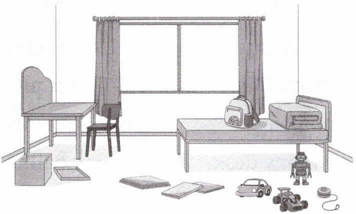 本题通过看图完成任务的形式,考查学生对英语方位表达、一般疑问句应答及祈使句的运用,同时培养学生观察图片和整理物品的意识。