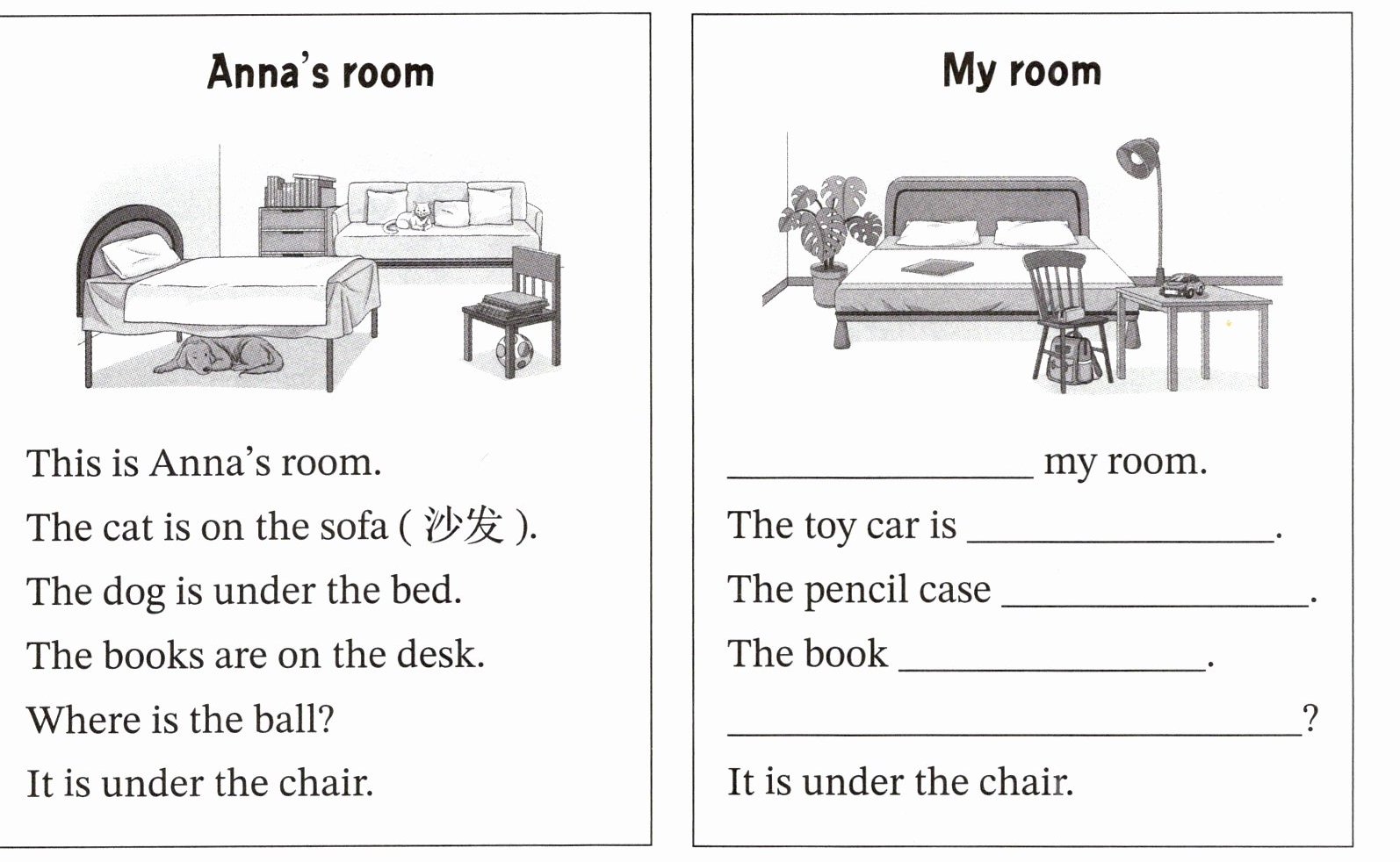 本题需仿照左侧Anna房间的描述句式,结合右侧“My room”的图片内容,填写物品的方位信息以完成句子。需先观察图片中各物品的位置:房间介绍用“This is”开头;玩具汽车在桌子上;铅笔盒在椅子上;书在床上;椅子下方是书包,对应问句需询问书包的位置。