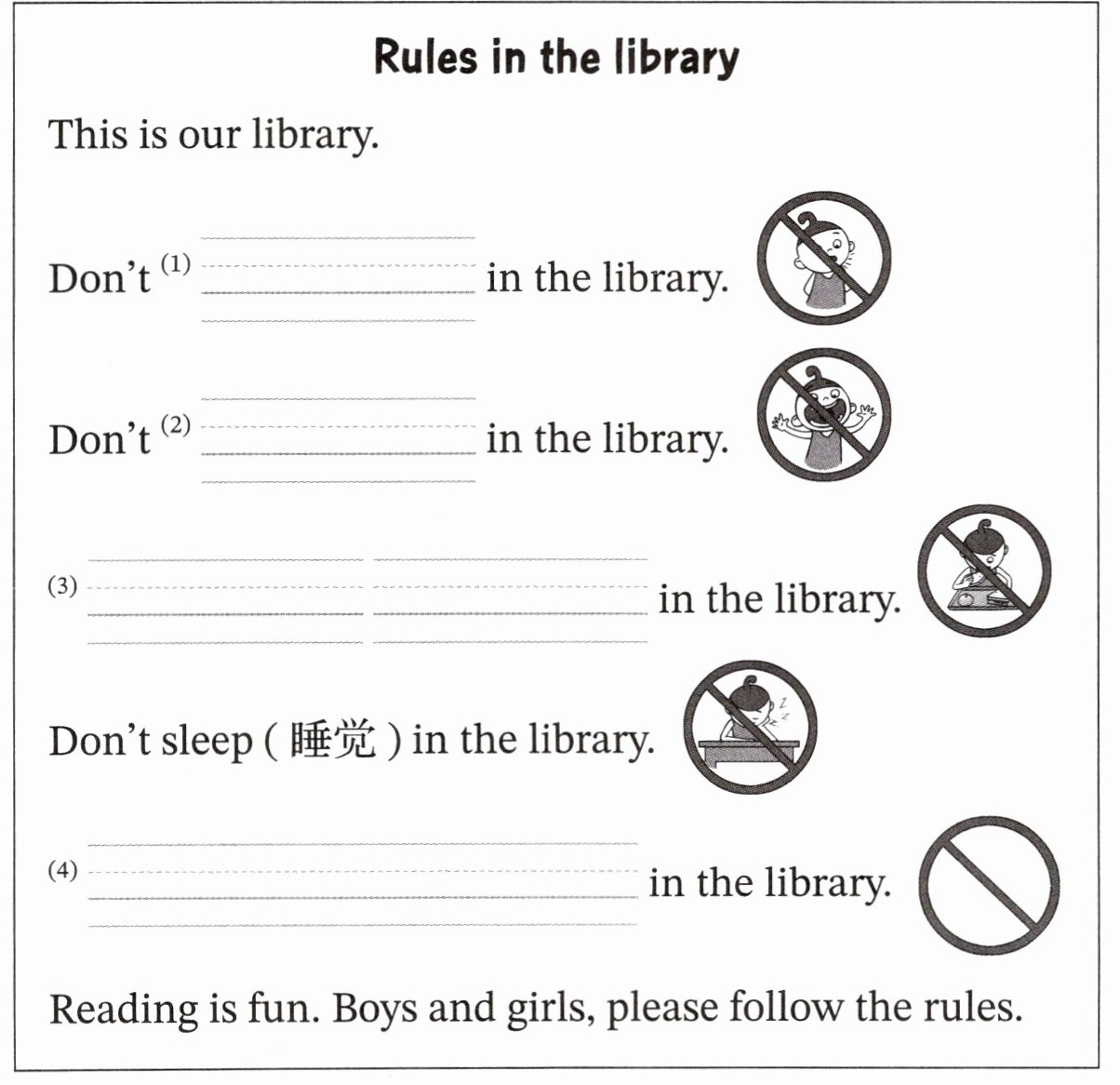 4. 最后一个空白禁止标识可填写图书馆内禁止的合理行为,如Don't run等,答案不唯一。