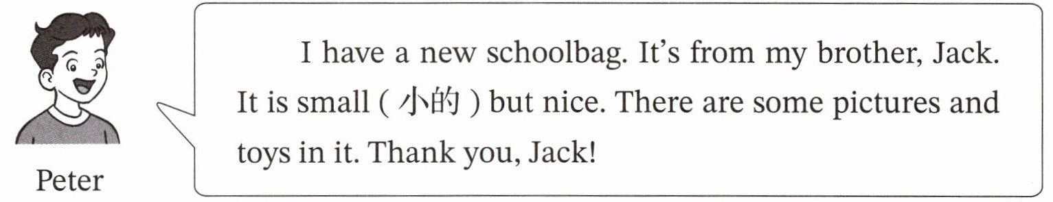 Peter: I have a new schoolbag. It's from my brother, Jack. It is small (小的) but nice. There are some pictures and toys in it. Thank you, Jack!