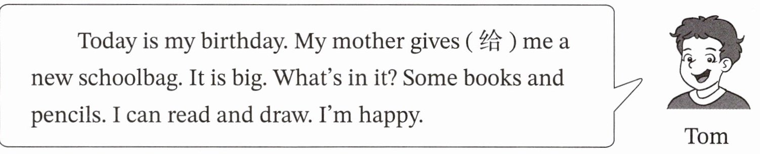 Tom: Today is my birthday. My mother gives (给) me a new schoolbag. It is big. What's in it? Some books and pencils. I can read and draw. I'm happy.