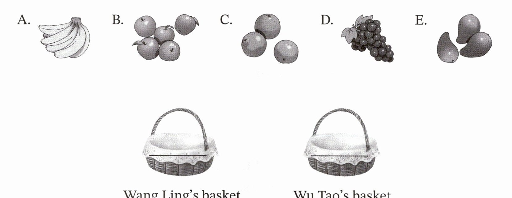答案:Wang Ling's basket: C, D, A, E