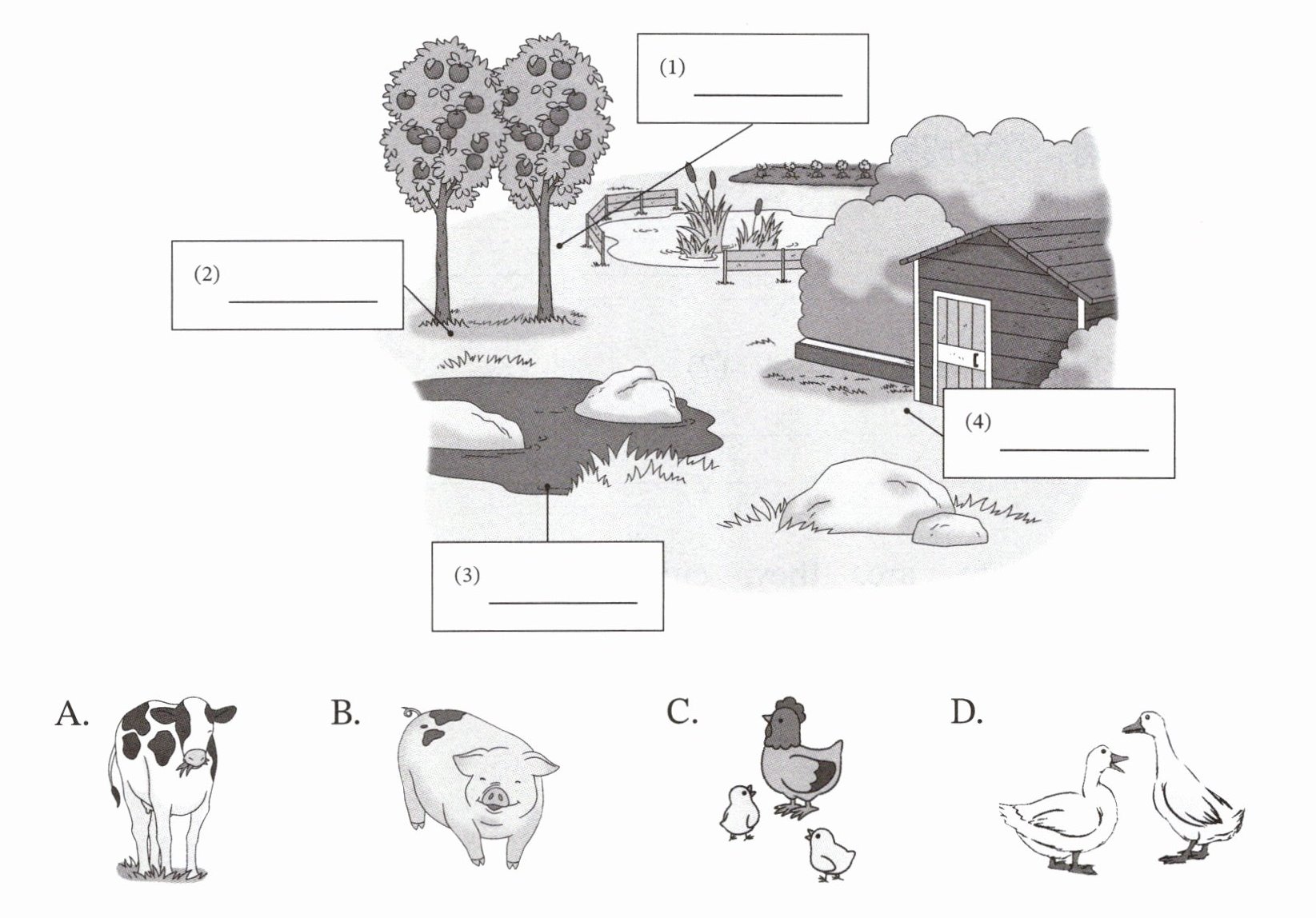 本题围绕农场主题,结合图文考查学生的阅读理解能力和词汇运用能力,需要学生准确提取短文中的关键信息,完成图文匹配和句子填空,能有效锻炼学生的信息整合与对应能力。