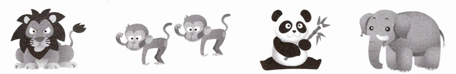这是一道听力排序题,需根据录音内容,识别每个动物对应的描述,按照录音出现的先后顺序给图片标注数字,正确排序为3(狮子)、2(两只猴子)、4(熊猫)、1(大象)。