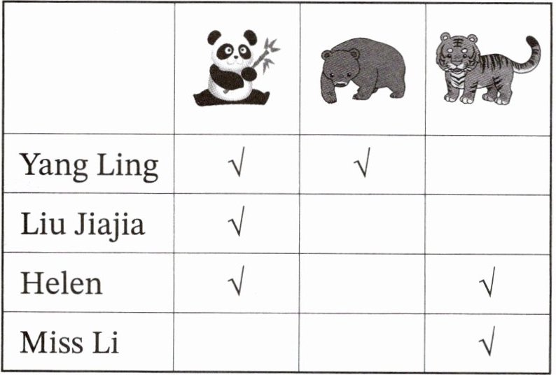 5. 表格显示Helen喜欢老虎,且Yang Ling提到Miss Li也喜欢老虎,故填tigers。