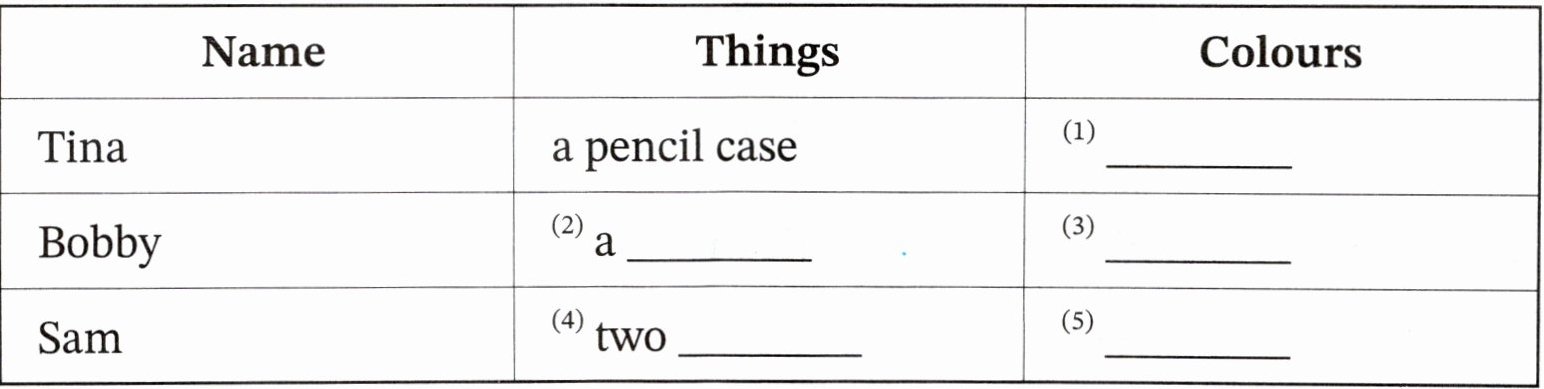 本题以表格形式考查学生听力细节捕捉能力,同时要求掌握常见文具与颜色类英语词汇,可提升学生听力理解与词汇运用能力。