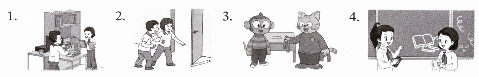 需结合图片场景匹配对话:1. 场景为整理书本,对应对话C;2. 场景为询问物品(尺子),对应对话B;3. 场景为指令擦桌子,对应对话D;4. 场景为谈论擦黑板,对应对话A。