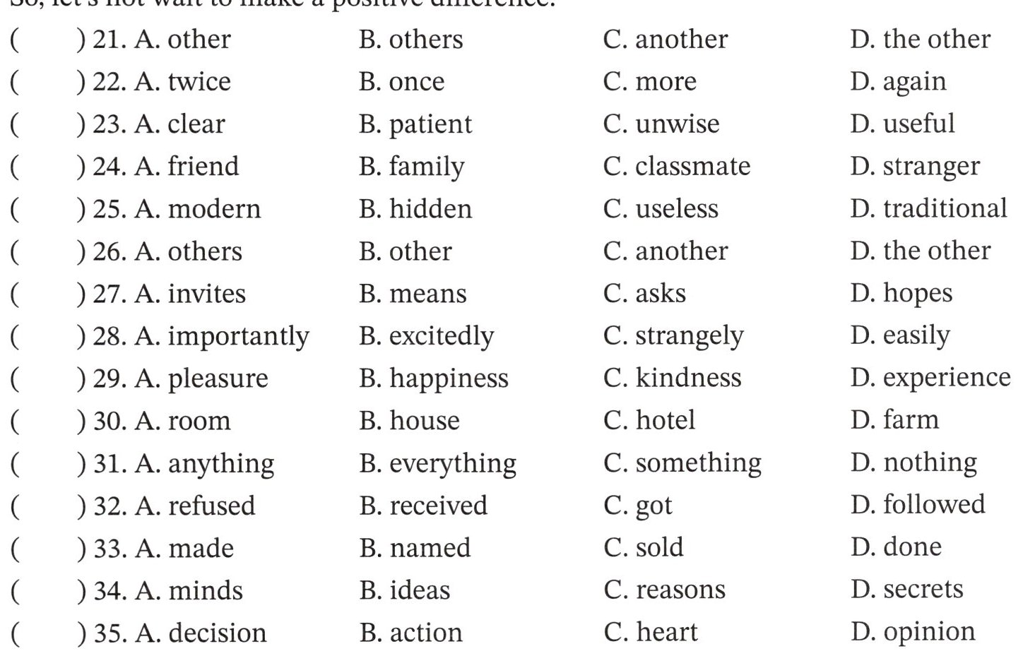 35 you may be touching. So, let’s not wait to make a positive difference.()21. A. other