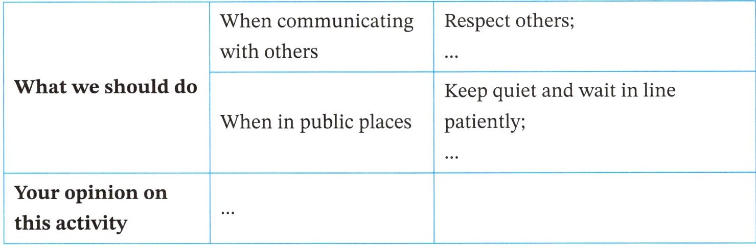 In our daily lives, when communicating with others, we should show respect by greeting them warmly and smiling. We should also realize the importance of honesty and be ready to lend a hand to those in need. When in public, remember to keep quiet in places like libraries and wait in line patiently. Don't litter or pick flowers in parks.