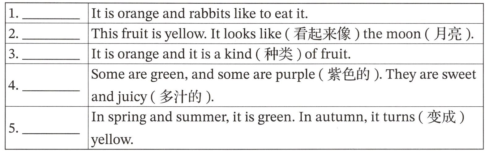Some are green, and some are purple (紫色的). They are sweet and juicy (多汁的).5.