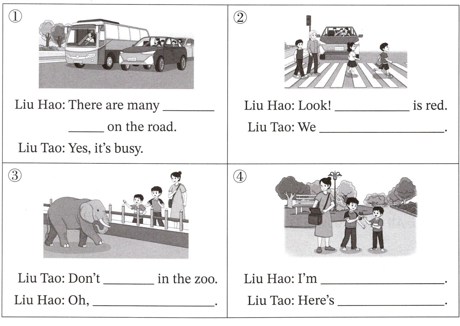 答案:a. 1. C 2. B b. 1. T 2. F c. 你今天不去上学吗? d.(答案仅供参考) ① Liu Hao: There are many cars and buses on the road. ② Liu Hao: Look! The traffic light is red. Liu Tao: We can't go. ③ Liu Tao: Don't feed animals in the zoo. Liu Hao: Oh, I'm sorry. ④ Liu Hao: I'm hot and thirsty. Liu Tao: Here's some water for you.