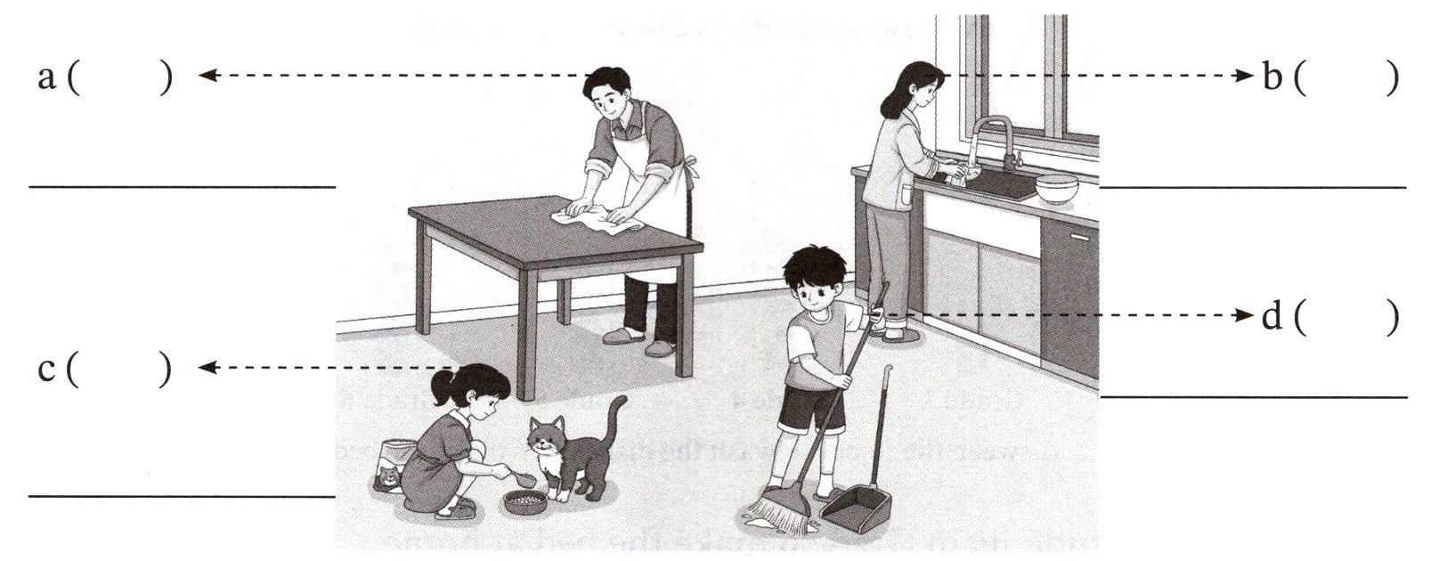 答案:一、d 1 sweep the floor b 2 wash the dishes a 3 clean the table c 4 feed the cat
