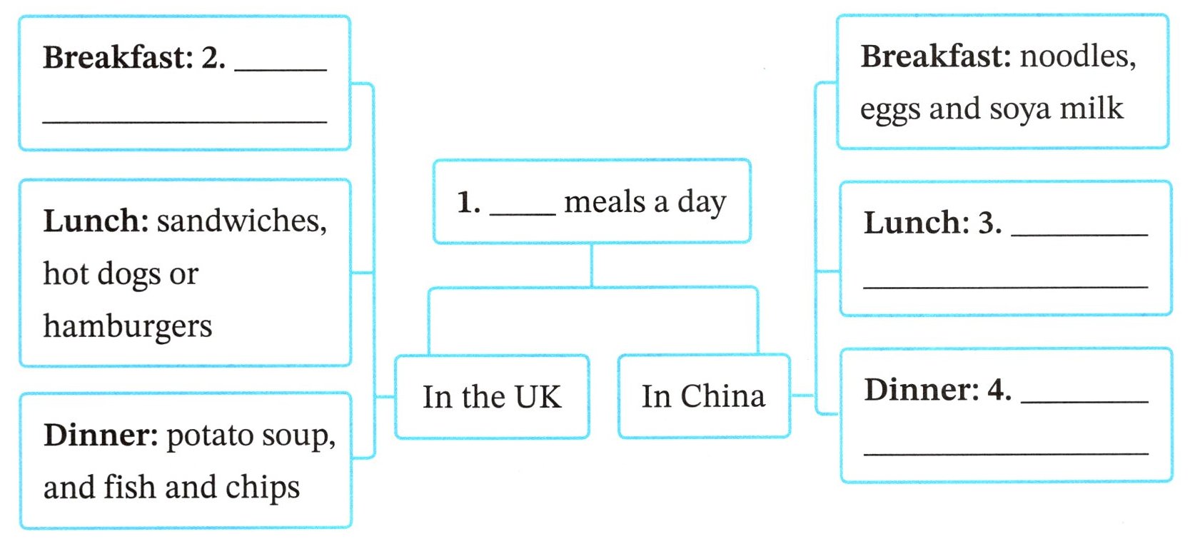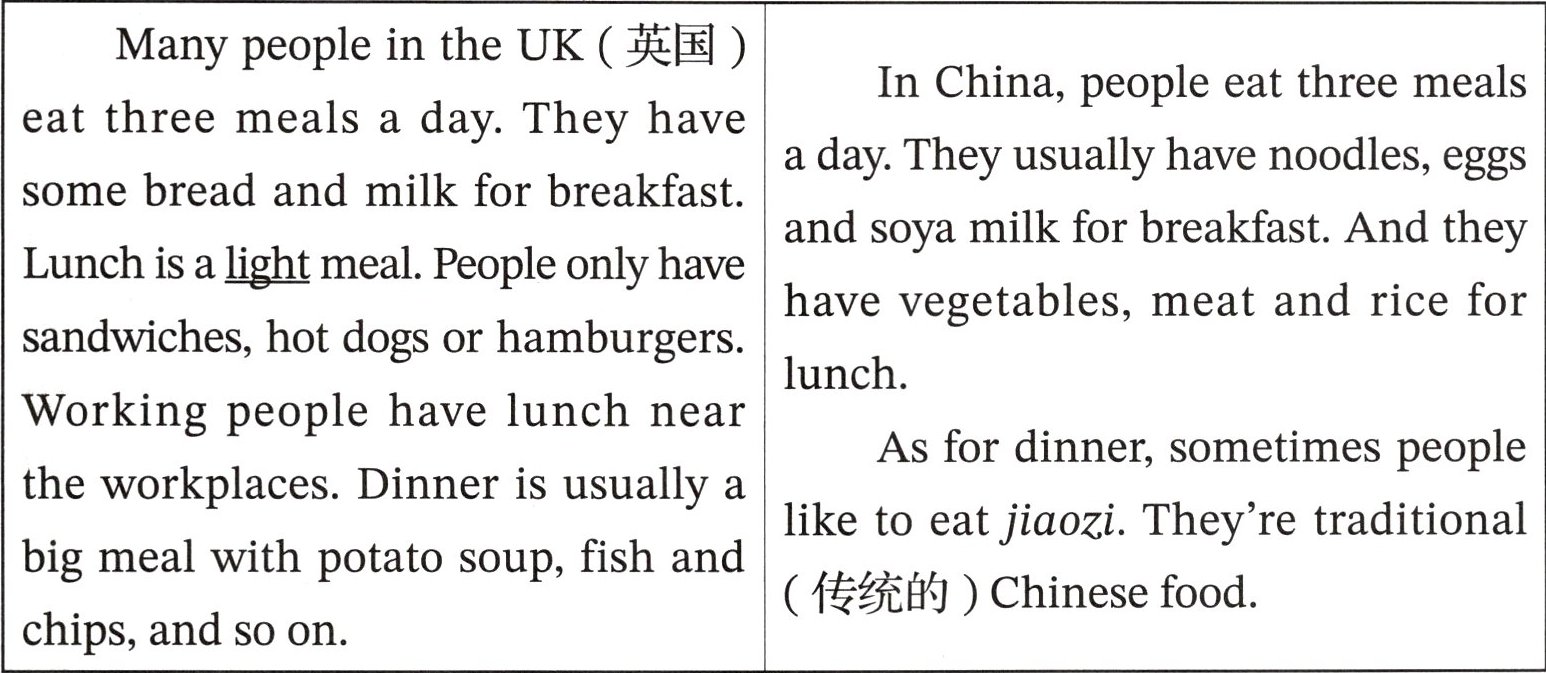 ) 2. Which is the best title (标题) for the passage? A. Nice food for the people B. Nice food in the UK C. What people eat in the UK and in China答案:a. 1. Three 2. bread and milk 3. vegetables, meat and rice 4. jiaozi