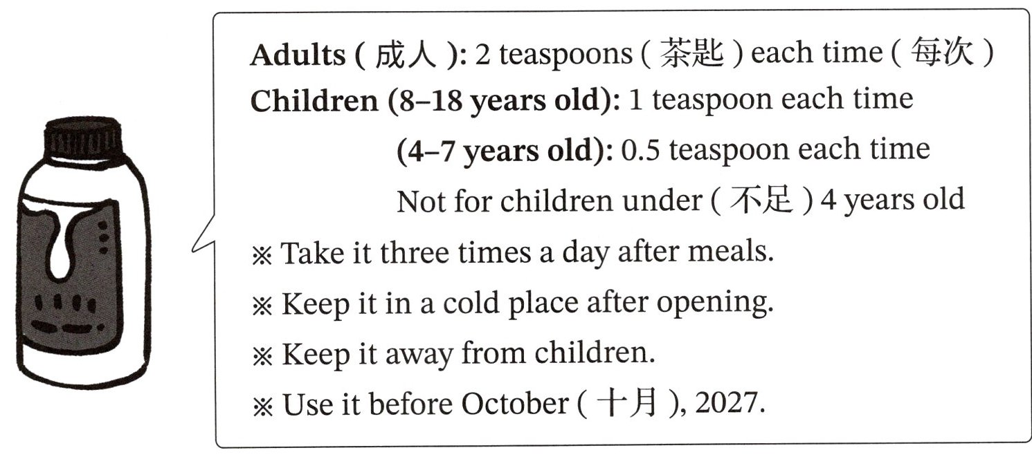 Linda is 13 years old. She is ill today. She goes to see the doctor. The doctor gives her some medicine. Here are the medicine instructions.