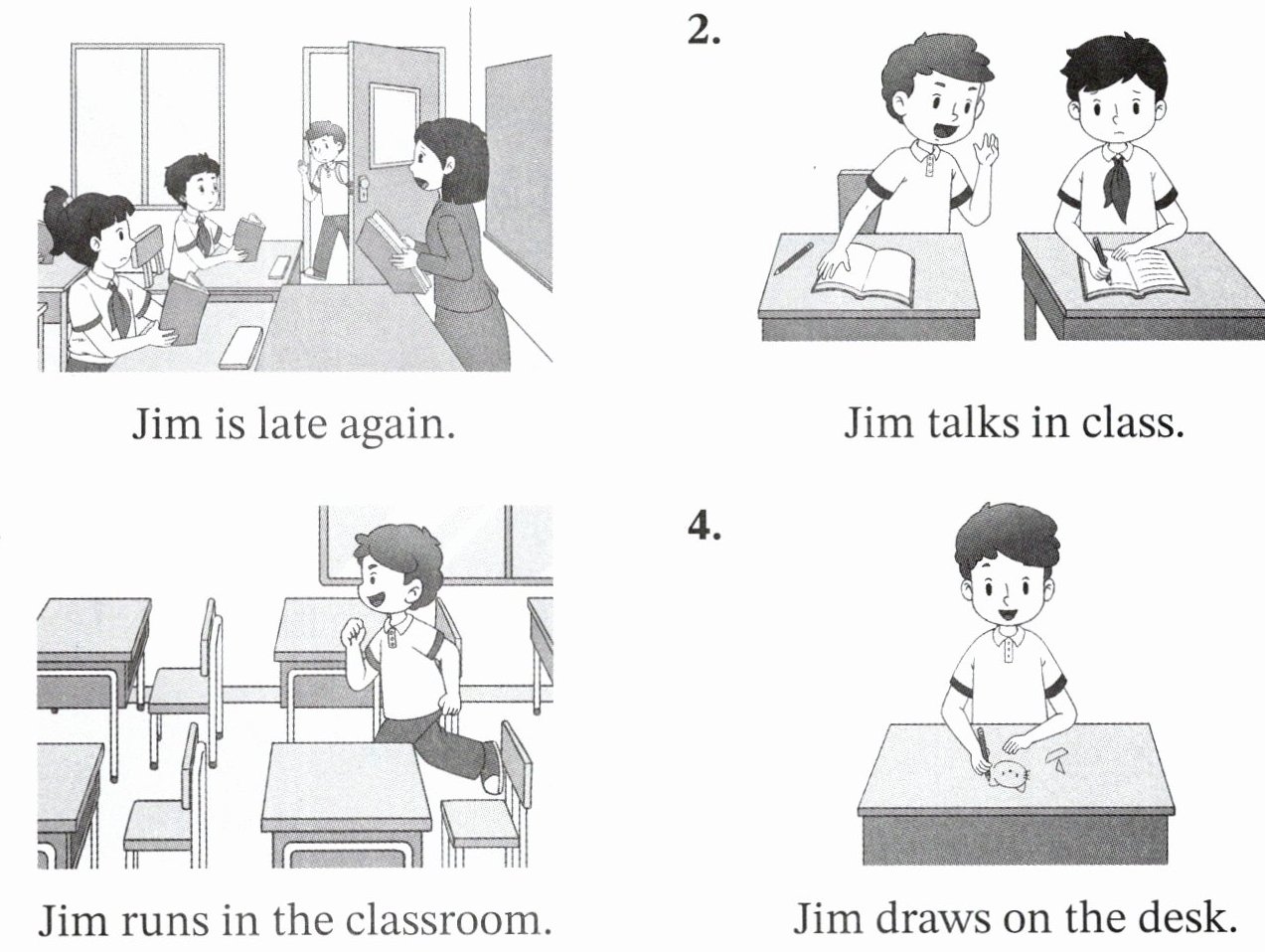 你想对每张图中的 Jim 说什么呢? 写在下面横线上。