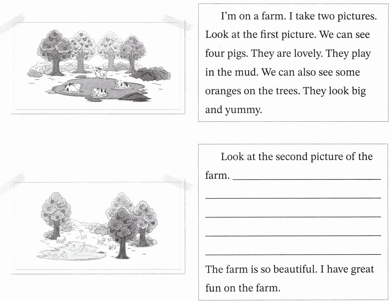 示例: Look at the second picture of the farm. We can see some apples on the trees. They are big and red. We can see some sheep. They are lovely. We can also see some ducks on the pond. They swim happily. The farm is so beautiful. I have great fun on the farm.