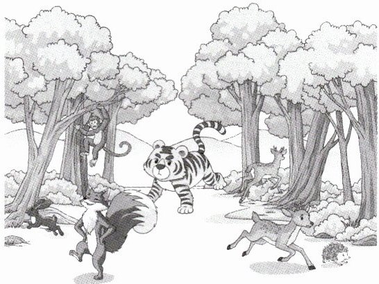 I'm a tiger. I walk in the forest (森林). I see a fox and want to eat him. The fox says, "I'm the king here! You can't eat me!" I don't believe (相信) him. The fox says, "Just follow (跟随) me and see."