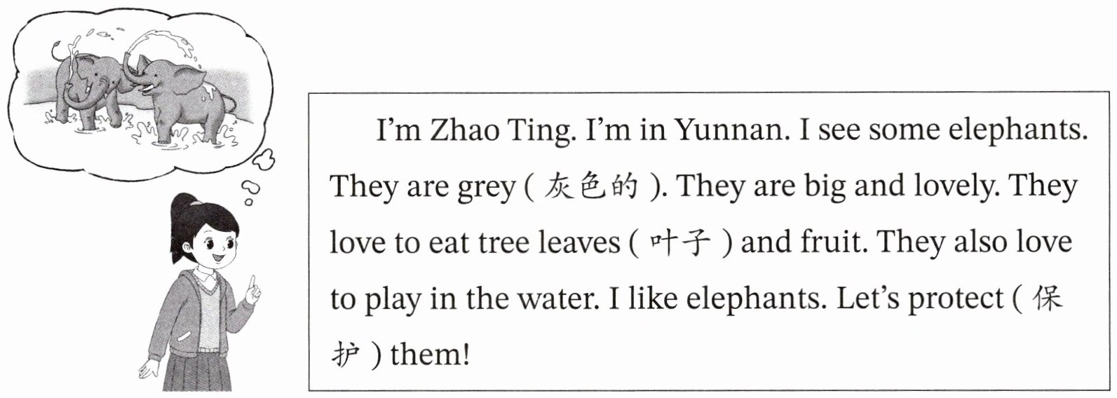 I'm Zhao Ting. I'm in Yunnan. I see some elephants. They are grey (灰色的). They are big and lovely. They love to eat tree leaves (叶子) and fruit. They also love to play in the water. I like elephants. Let's protect (保护) them!