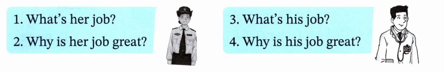 2. 关于为什么她的职业很棒,可以想到警察帮助人们解决问题、维护安全等原因,所以回答应为“She helps people and keeps them safe.”
