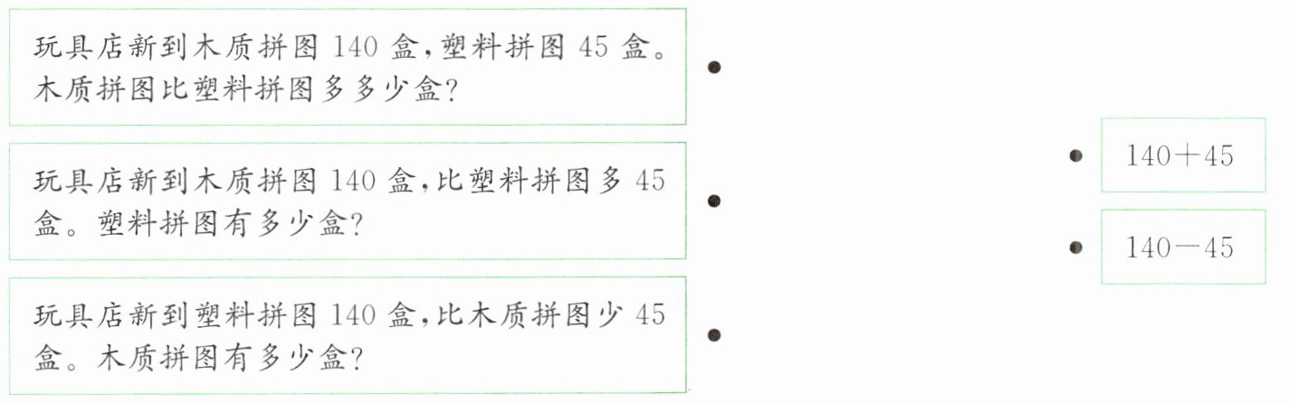 2. 题目二问比塑料拼图多45盒,塑料拼图有多少盒,用减法计算:$140 - 45$。