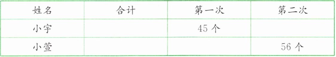 7. 小宇和小萱练习投篮。小宇第二次比第一次多投10个,小萱第二次比第一次少投8个。根据条件算一算、填一填。