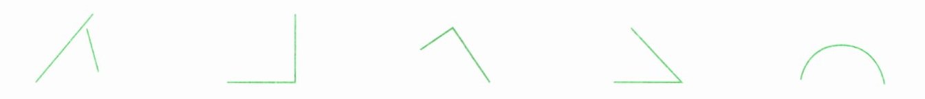 根据角的定义,角是由一个顶点和两条直直的边组成的。第一个图形两条边未相交于一点,不是角;第二个图形有一个顶点和两条直直的边,是角;第三个图形有一个顶点和两条直直的边,是角;第四个图形有一个顶点和两条直直的边,是角;第五个图形是曲线,不是角。