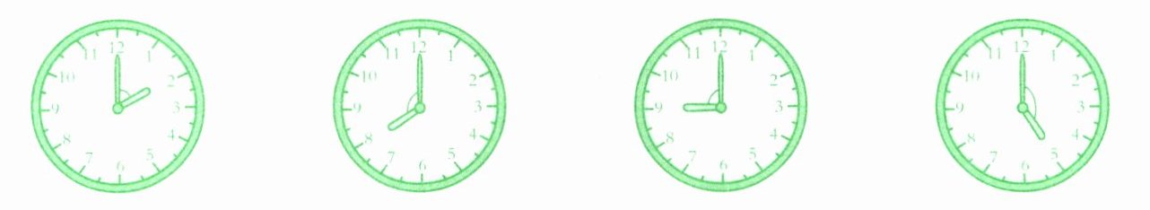 钟表一圈为360°,每个大格对应30°。计算各钟表时针与分针的夹角: