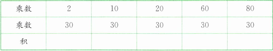 观察可得:一个乘数$30$不变,另一个乘数从$2$变为$10$($2×5 = 10$),积从$60$变为$300$($60×5 = 300$);另一个乘数从$10$变为$20$($10×2 = 20$),积从$300$变为$600$($300×2 = 600$)等。