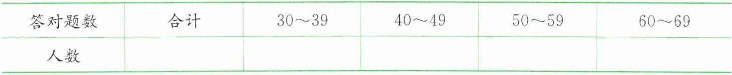 | 答对题数 | 合计 | 30~39 | 40~49 | 50~59 | 60~69 |