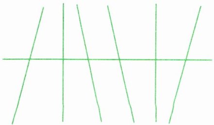 第三个图形上底和下底两条线段互相平行,用同一种颜色(如绿色)描出。