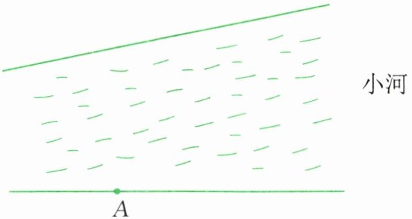 答案:过点$A$作小河另一岸的垂线,即为最短路线,画图如下(垂线段$AB$):