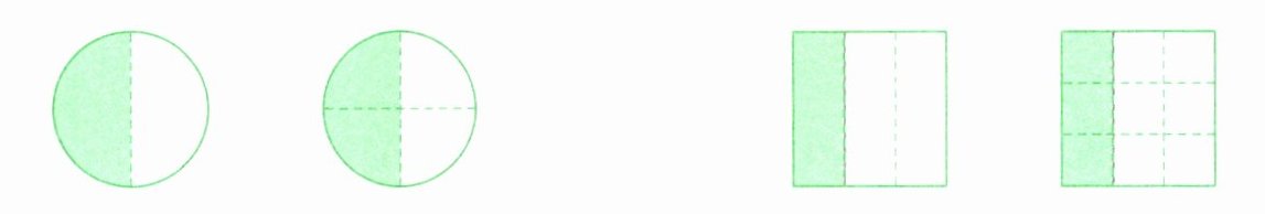 第一个图中,第一个圆平均分成2份,涂色1份是$\dfrac{1}{2}$;第二个圆平均分成4份,涂色2份,所以$\dfrac{1}{2}=\dfrac{2}{4}$。第二个图中,第一个正方形平均分成3份,涂色1份是$\dfrac{1}{3}$;第二个正方形平均分成9份,涂色3份是$\dfrac{3}{9}$,所以$\dfrac{1}{3}=\dfrac{3}{9}$。