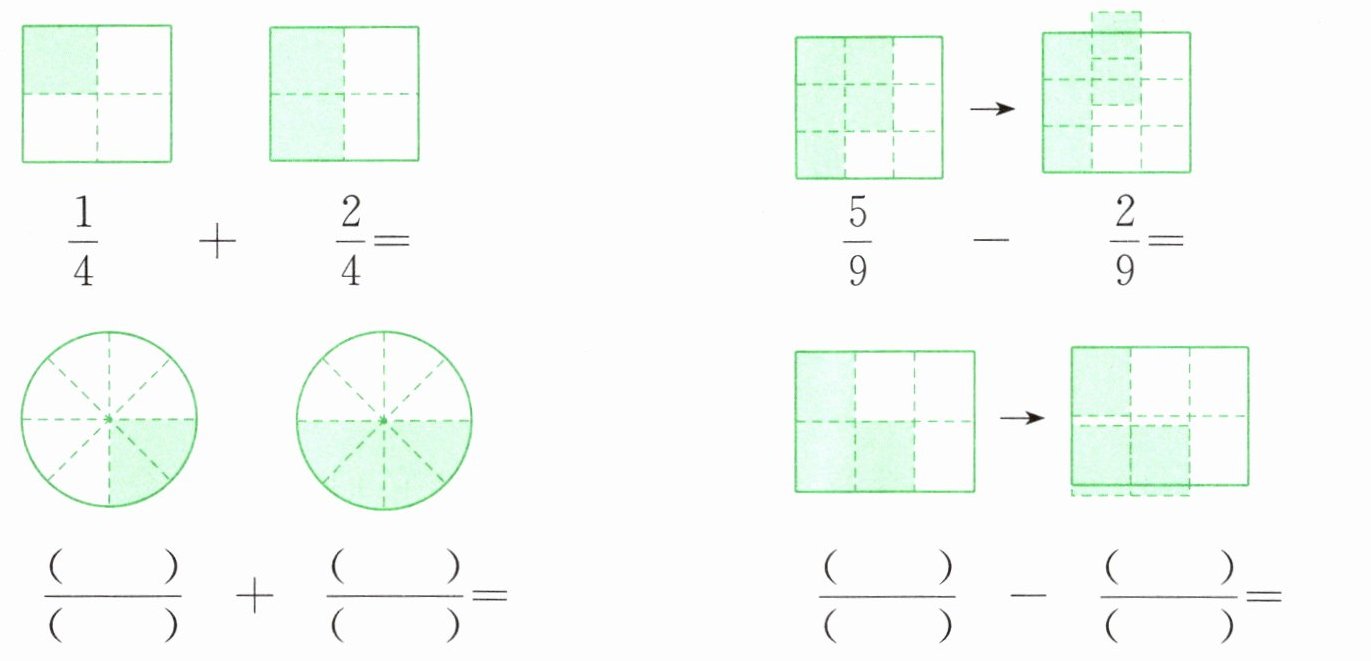 $\dfrac{5}{9}+\dfrac{2}{9}=$ $\dfrac{2}{4}+\dfrac{1}{4}=$ $\dfrac{2}{3}-\dfrac{1}{3}=$ $\dfrac{3}{10}+\dfrac{5}{10}=$