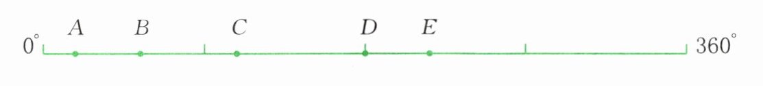 2. 观察数轴:$56.5°$的度数对应图中的点B。