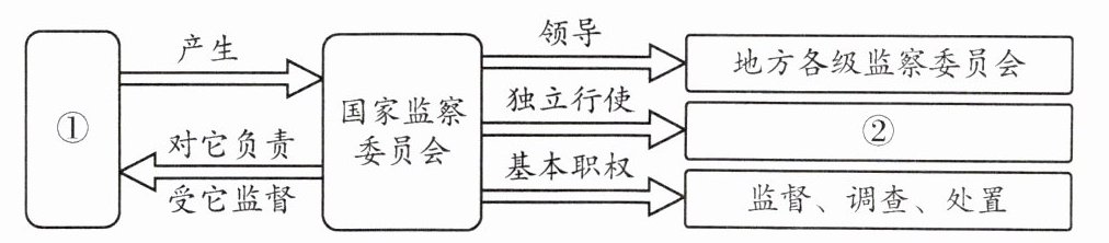 根据国家监察机关的相关知识,国家监察机关由国家权力机关产生,对它负责,受它监督。国家权力机关中最高的是全国人民代表大会,所以①处应填全国人民代表大会。监察机关的职责是行使监察权,检察权属于检察机关,行政权属于行政机关,司法权属于司法机关,故②处应填监察权。