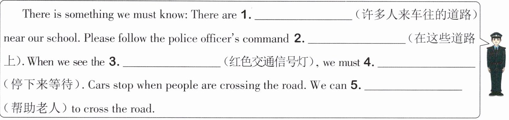 一、警察叔叔正在进行“文明出行”主题的宣讲。请根据中文提示,完成警察叔叔的发言稿。
