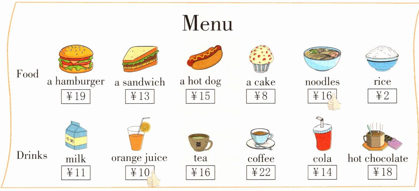 五、[新素材]学校旁边新开了一家小吃店,David 想要去尝尝,这是它的菜单,David 在想吃的东西上画了"👍"。请你根据菜单内容,选择正确的答案。