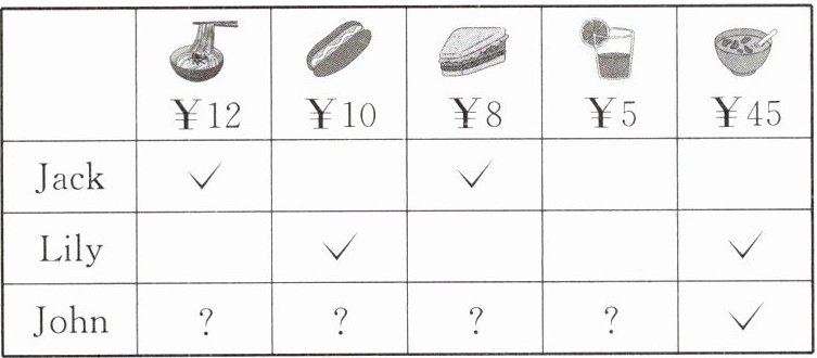 and soup. What about John? John has ¥50. He can buy (买) soup and .答案:四、noodles; sandwich; hot dog; juice